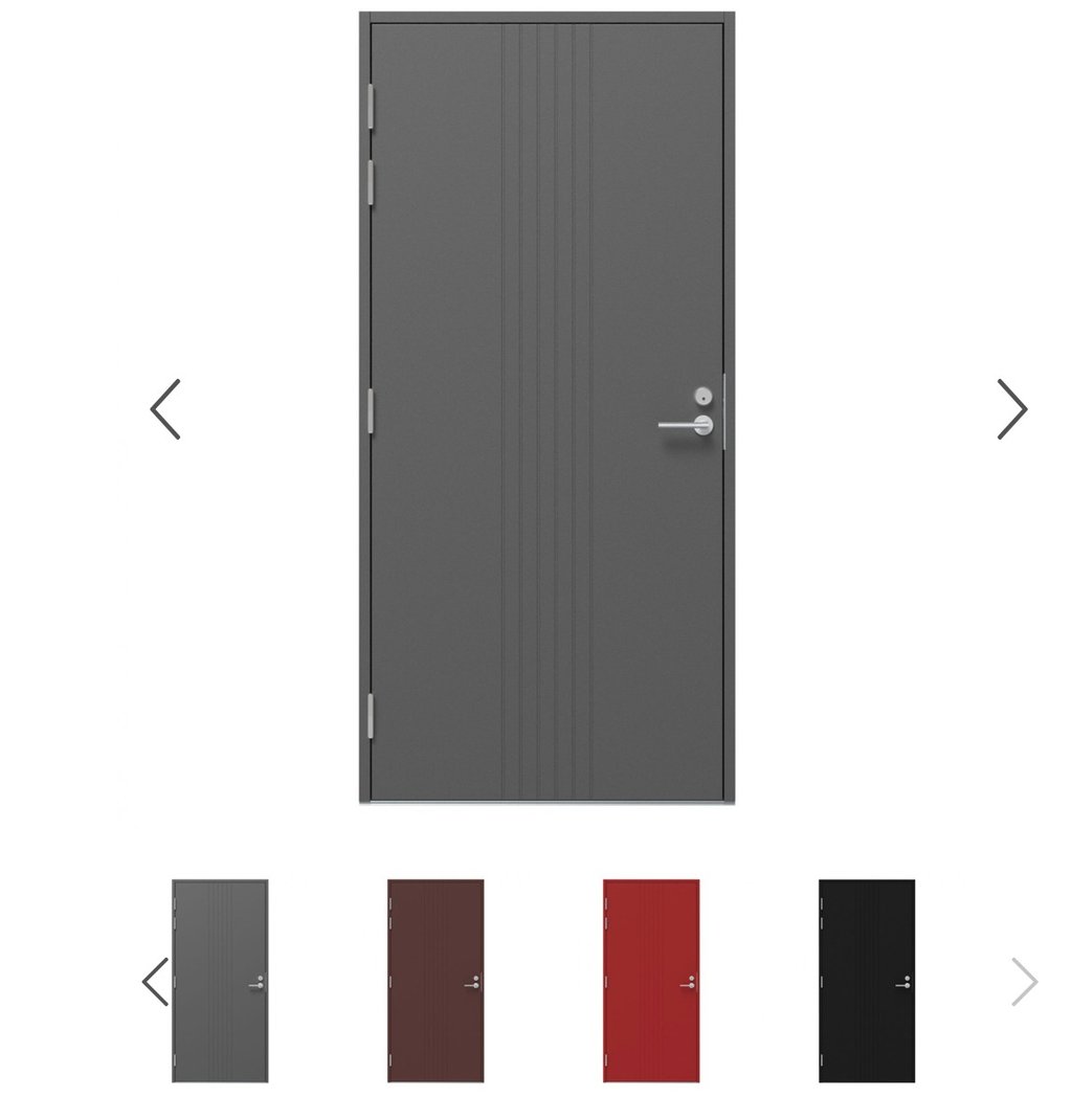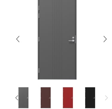 Selasimme eri malleja ja värejä. Itse olisin halunnut punaisen oven, mutta päädyimme rauhallisempaan vaihtoehtoon, tumman harmaaseen. Etupihan sisäänkäynnin ulko-oven viereen tulee korkea ikkuna, jolloin itse oven u-arvo on parempi.