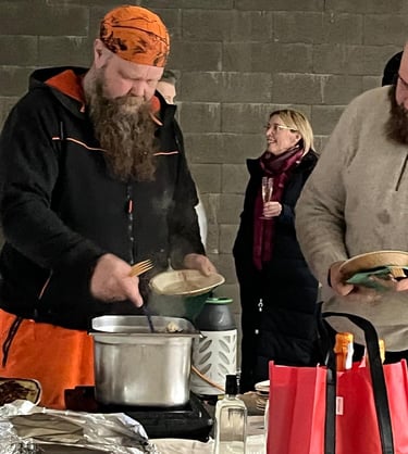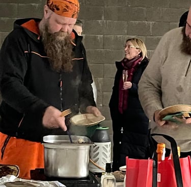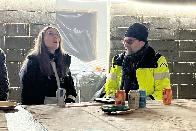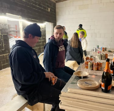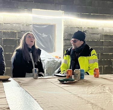Yksi rakennusmiehistämme oli jopa rakentanut purkulaudasta tupakeittiön penkit ja pöytäliinoilla peitetyt uretaanilevyt toimivat pöytinä. Harri piti puheen, ja tunnelma oli hetkittäin jopa hieman harras. Sydämeni oli pakahtua katsellessani ahkeria ja taitavia nuoria rakennusmiehiämme, jotka nauttivat tarjottavista ja keskustelivat työviikon päätteeksi.