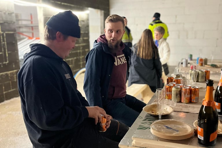 Illaksi kotiin -rivitalomme on saanut katon. Se on merkittävä virstanpylväs. Jatkossa rakennusvaiheet eivät ole enää yhtä voimakkaasti säiden armoilla. Sisätilojen rakentaminen voi alkaa. Vietimme harjakaiset kymppimiehiemme kanssa.