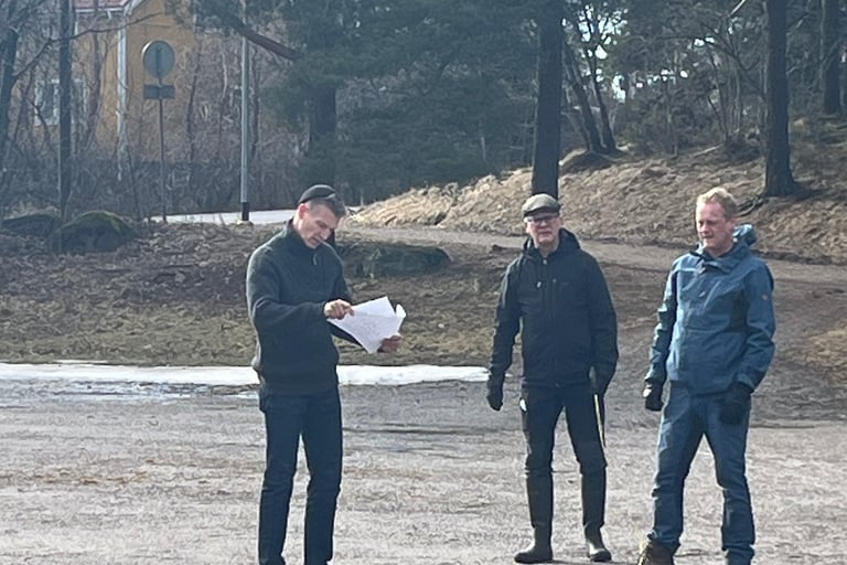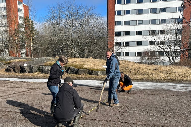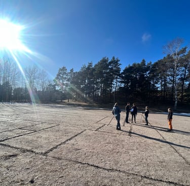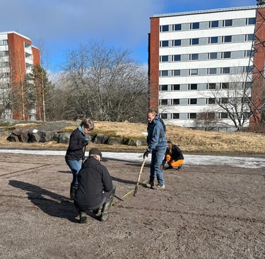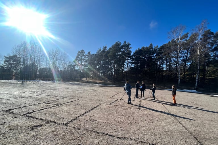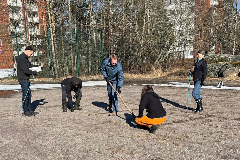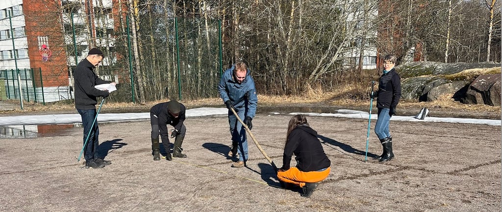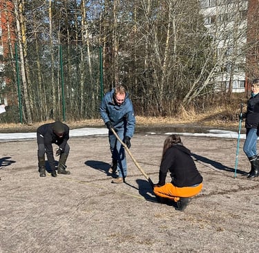 Tulevan kodin mittasuhteita on vaikea hahmottaa vaiheessa, jossa ryhmärivari on vasta pilkkeenä silmäkulmassa. Piirsimme keväisenä sunnuntaina Illaksi kotiin -kotimme pohjapiirroksen aidoissa mittasuhteissa juuri lumen alta paljastuneelle fudiskentälle.