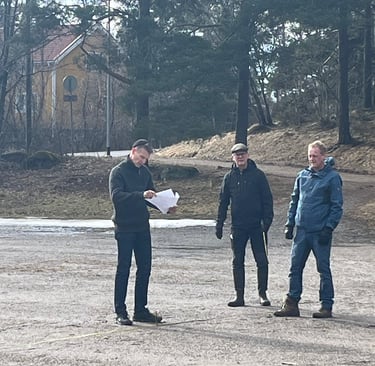 Mietimme laatikon ulkopuolelta, miten voisimme hahmottaa tulevien kotiemme todellisia mittasuhteita. Ovien, seinien, vesipisteiden ja viemärilinjastojen suhteen päätöksiä piti alkaa tehdä. Himosaunojana Itseäni kuumotti suunnitellun saunan koko. Miten mahtua pötköttämään ihan omille lauteilleni toteuttamaan jokapäiväistä rentoutumistankkaustani. Markkua kiinnosti katetun terassin koko ja Liisan kanssa pohdittiin ovien asettumista järkevästi. Vaatehuoneiden koko, WC:n paikka ja eteisen tilanjärjestely aukesivat mukavasti kuraisen kentän tilataideteoksena.