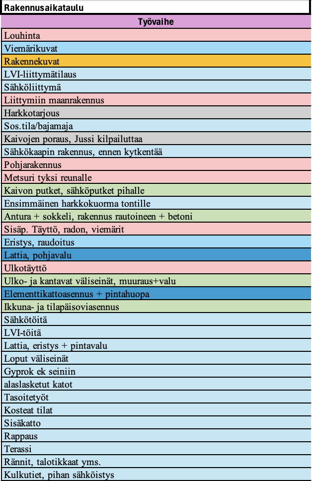Tärkeintä rakennusprojektin aikataulutussuunnitelmassa on kapellimestari, joka tuntee orkesterinsa ja johtaa sitä edestä. Meillä kapelliemestarina on toiminut saappaat savessa Kaitsu ja hänen stunttinansa on ollut erityisen uskottavasti Laura. Itselläni ei ollut mitään käsitystä työjärjestyksestä ja sainkin hyvissä ajoin keväällä kouraani Exel-tiedoston koskien tulevia tapahtumia. Jos kukaan ei olisi ottanut vastuuta kokonaiskuvasta, tästäkään projektista ei olisi tullut yhtään mitään.