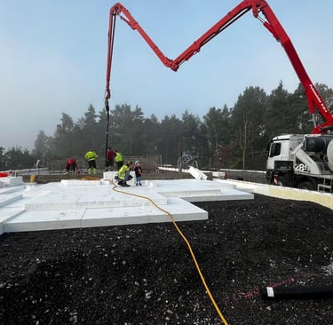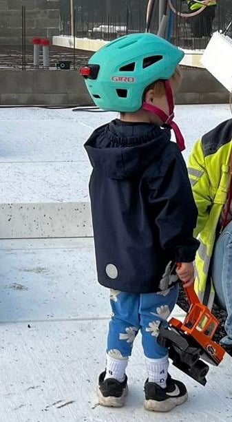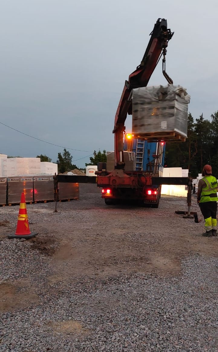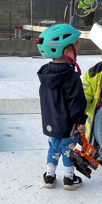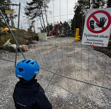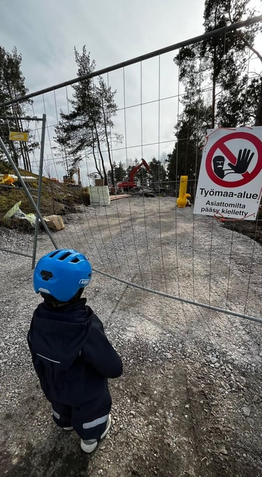 Rakennustyömaa ja varsinkin työmaalla liikkuvat isot koneet ovat mielenkiintoisia, ainakin lasten mielestä. Aidan takana näkyy usein pientä väkeä katselemassa ja ihmettelemässä. Nuorempien sukupolvien kanssa on sovittu, että ainoastaan erikseen sovittuina ja rauhallisempina hetkinä, saa tontille tulla opastettuna ihmettelemään ja katselemaan kaivinkoneita tai pyöräkuormaajaa lähempää. Turvallisuus ennen kaikkea!Louhintavaihe porauksineen ja räjäytyksineen oli hieman pelottavaa ainakin osalle pienistä katsojista ja tätä työvaihetta sai katsella ainoastaan työmaa-aitojen takas. Betongbilen,betonipumppuauto ja pohjalaatan valutyö on todella jännittävää! Omat koneet saa myös ottaa mukaan. Kaikki työntekijät ovat ystävällisesti tervehtineet pieniä, uteliaita ja innokkaita vierailijoita. Betoniauton kuskille kunniamaininta, papukaijamerkki ja suuri kiitos pikkumiehen huomioimisesta.